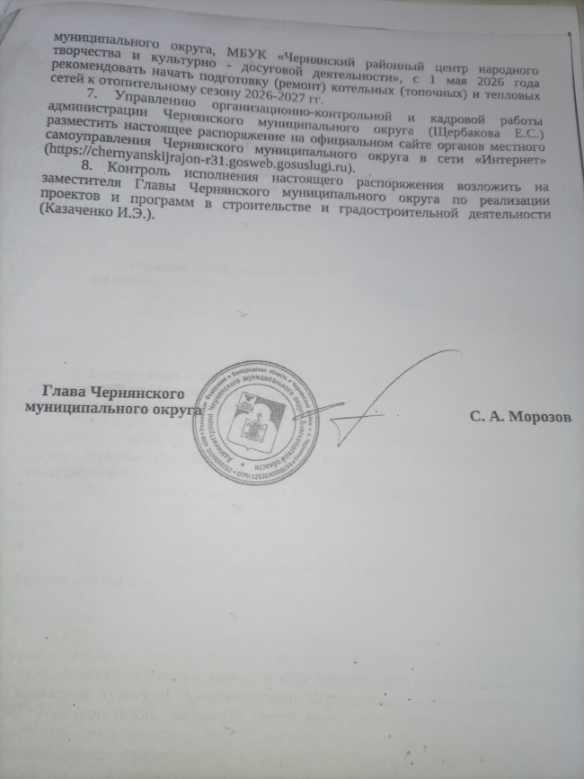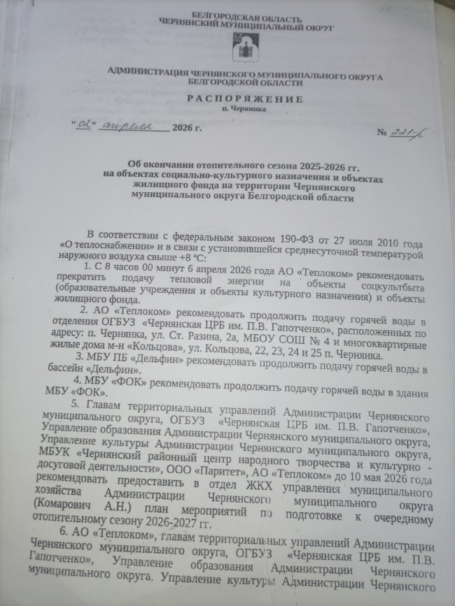 Распоряжение об окончании отопительного сезона 2025-2026 гг